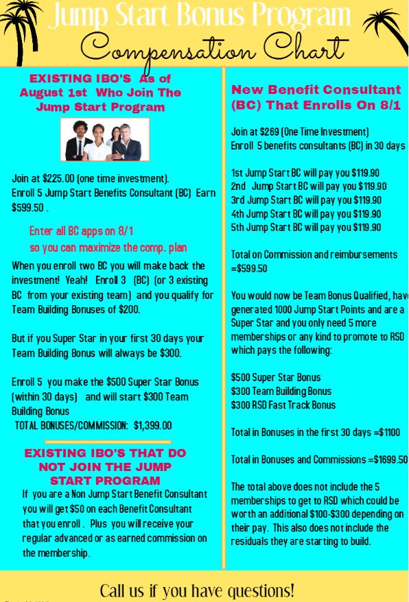 weeks before august one to plan to receive our $500 bonuses. I want to point out to you... if you have an Benefits consultant (BC) prospect that is interested in enrolling into the Jump Start program.... big picture... if someone signs for the $269 plan, they won't be paying the $24.95 / year for their sites and once they have 4 plans on the books will not be paying their $24.95 / month either. (Enroll 4 and pay no more). Clearly a stronger choice if the